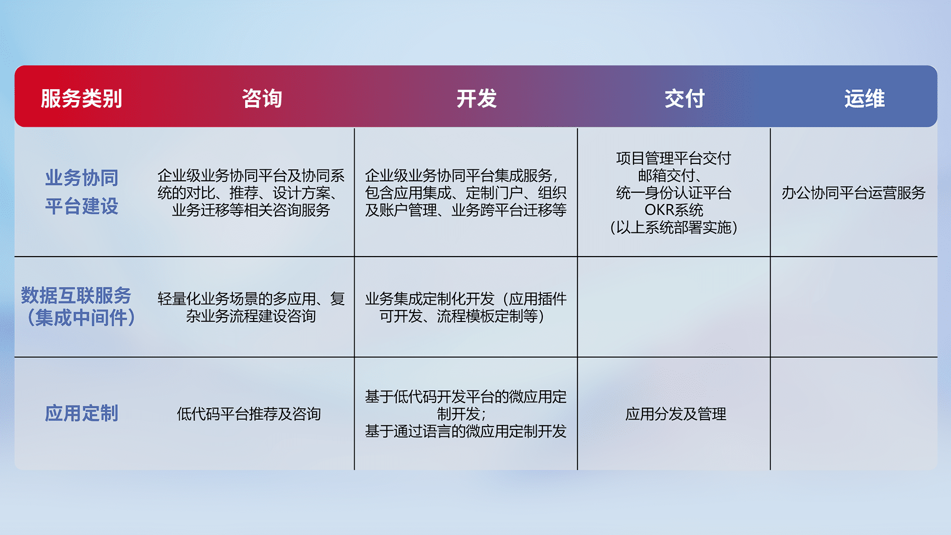 针对钉钉、、企微、、IDaas等平台级产品提供产品的规划、、方案、、、、交付、、定制化开发等服务,,,实现如统一协同办公、、、智能客户服务、、混合会议管理、、智能数据查询、、、、等业务场景,,实现数字化转型。。。。